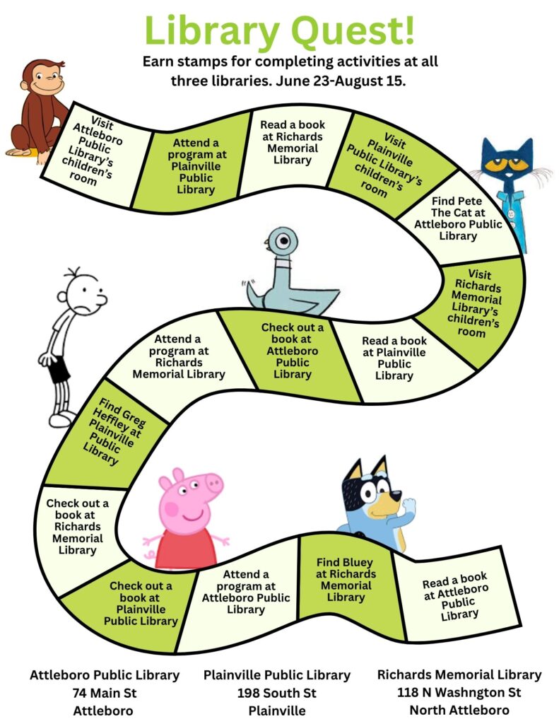 In addition to the regular Summer Reading Program, families are encouraged to explore nearby libraries! Earn stamps by visiting the Attleboro, North Attleboro and Plainville Public Libraries. Ask for a game board or print this one and begin your quest!